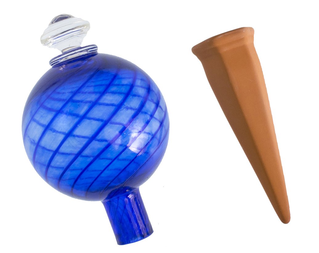 This cobalt blue water globe works well for vacation watering but requires careful monitoring to avoid overwatering your plants.